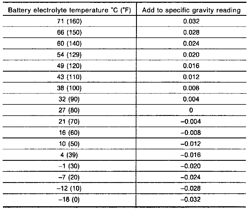 Use the chart to correct your hydrometer reading according to electrolyte temperature.