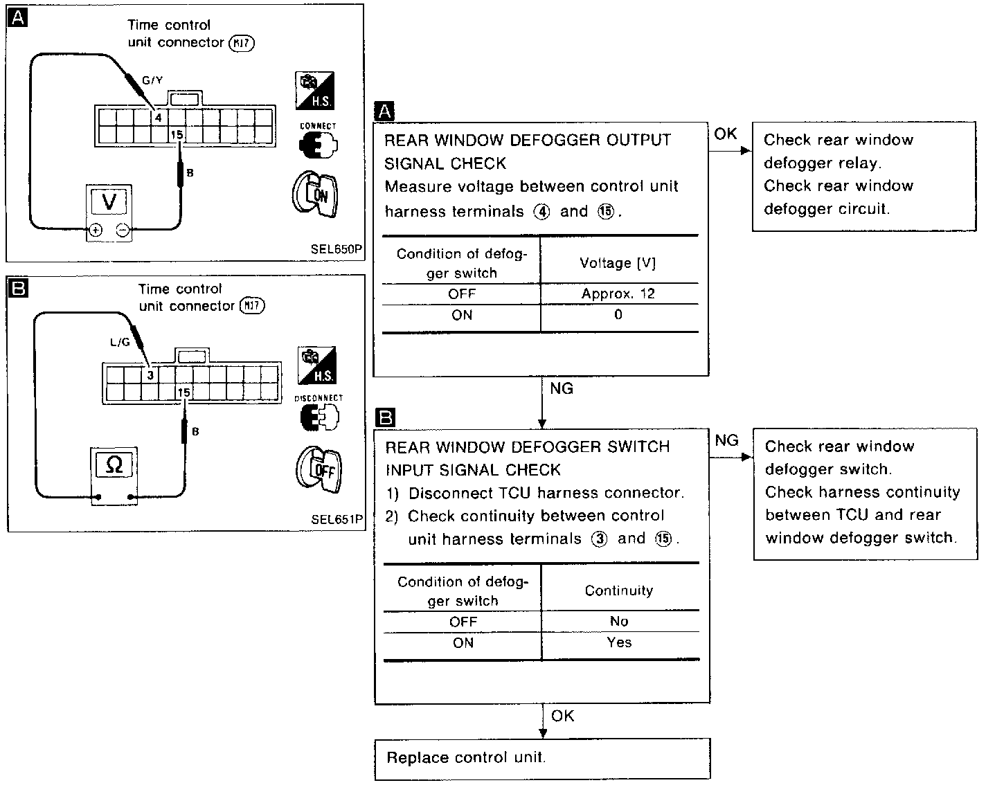 SYMPTOM: Rear defogger does not activate, or does not go off after activating.