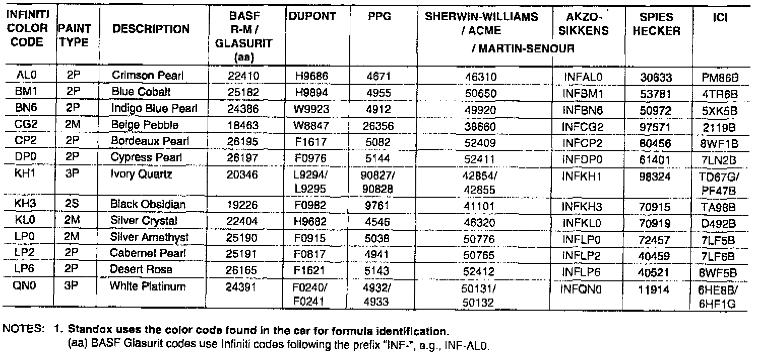 The following charts identify 1996 Infiniti paint codes, New Cross Link Clear Coat (NCLC) usage, color names and refinish paint codes for major automotive paint manufacturers. For approved NCLC clear coat products and procedures, refer to Infiniti bulletin ITB950-016.