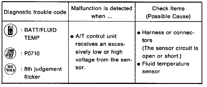 Selector lever in D, vehicle speed higher than 10 km/h (6 MPH), throttle opening greater than 1/8 of the full open position, engine speed higher than 450 rpm and driving for more than 10 minutes.