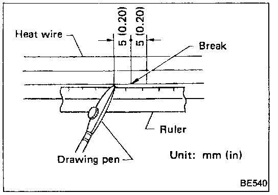 3. Place ruler on glass along broken line. Deposit conductive silver composition on break with drawing pen. Slightly overlap existing heat wire on both sides [preferably 5 mm (0.20 in)] of the break.