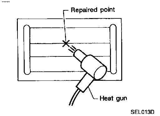 5. Apply a constant stream of hot air directly to the repaired area for approximately 20 minutes with a heat gun. A minimum distance of 3 cm (1.2 in) should be kept between repaired area and hot air outlet. If a heat gun is not available, let the repaired area dry for 24 hours.