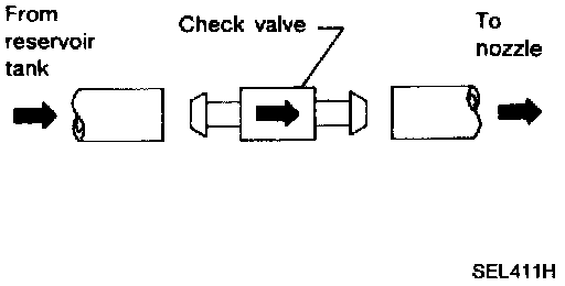 A check valve is provided in the washer fluid line. Be careful not to connect check valve to washer tube in the wrong direction.