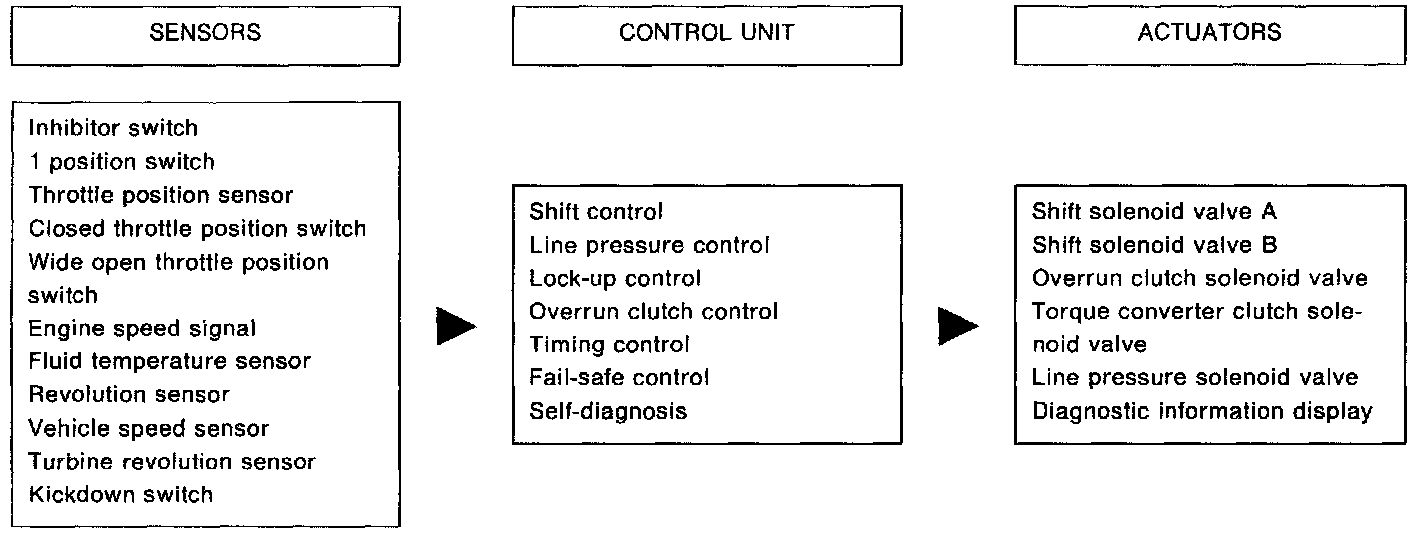The RE4RO3A automatic transmission senses vehicle operating conditions through various sensors. It always controls the optimum shift position and reduces shifting and lock-up shocks.