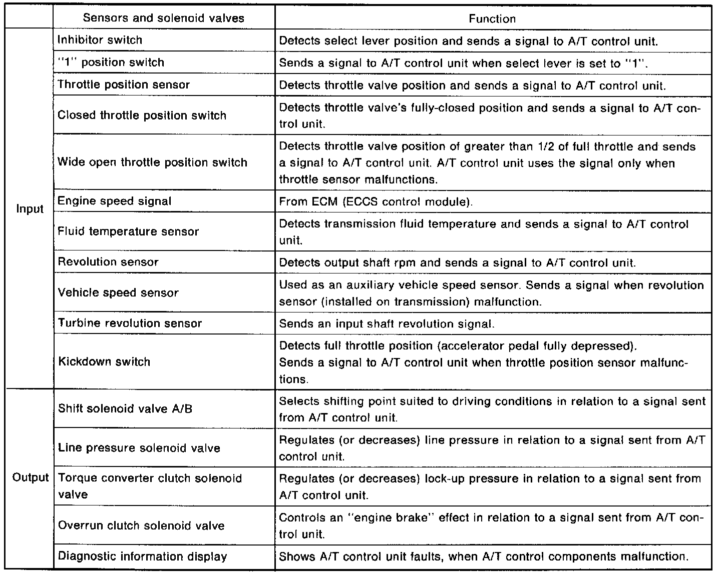 Input/Output Signal Of A/T Control Unit: