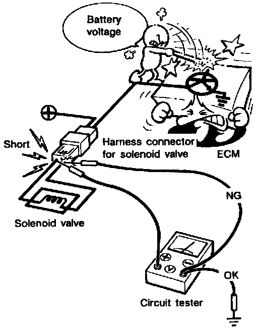 - When measuring ECM signals with a circuit tester, never bring the two tester probes into contact. Accidental contact of probes will cause a short circuit and damage the ECM power transistor.