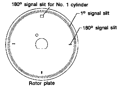The rotor plate is positioned between the LED and the photo diode. The LED transmits light to the photo diode. As the rotor plate turns, the slits cut the light to generate rough-shaped pulses. These pulses are converted into on-off signals by the wave-forming circuit and sent to the ECM.