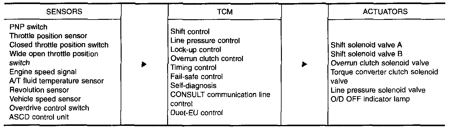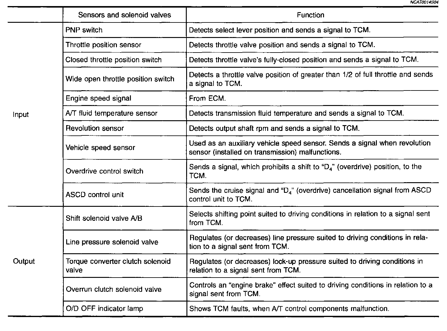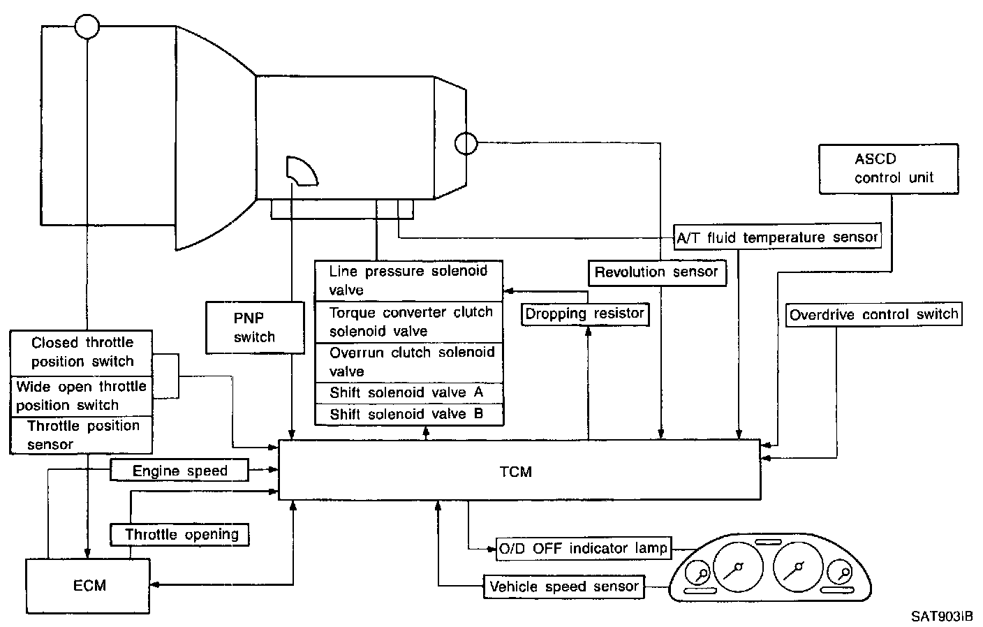 The TCM activates shift solenoid valves A and B according to signals from the throttle position sensor and revolution sensor to select the optimum gear position on the basis of the shift schedule memorized in the TCM.
