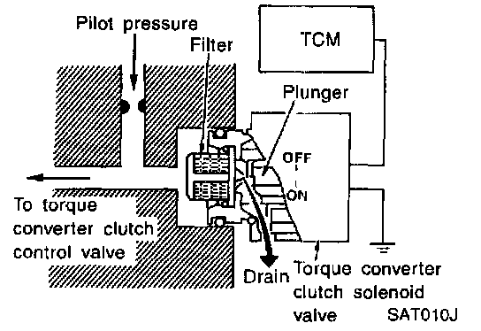 The torque converter clutch solenoid valve is controlled by the TCM. The plunger closes the drain circuit during the "OFF" period, and opens the circuit during the "ON" period. If the percentage of OFF-time increases in one cycle, the pilot pressure drain time is reduced and pilot pressure remains high.