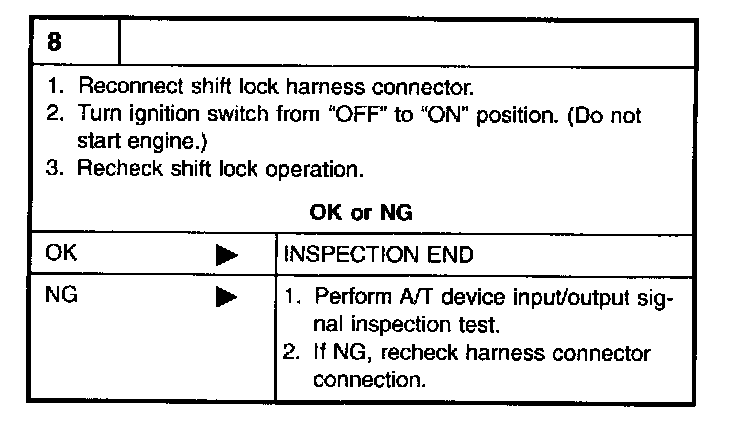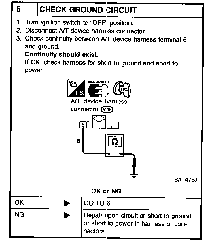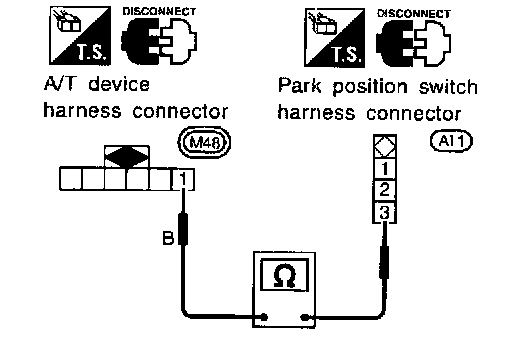 ^ Check continuity between A/T device harness terminal 6 and shift lock solenoid & park position switch harness terminal 3.