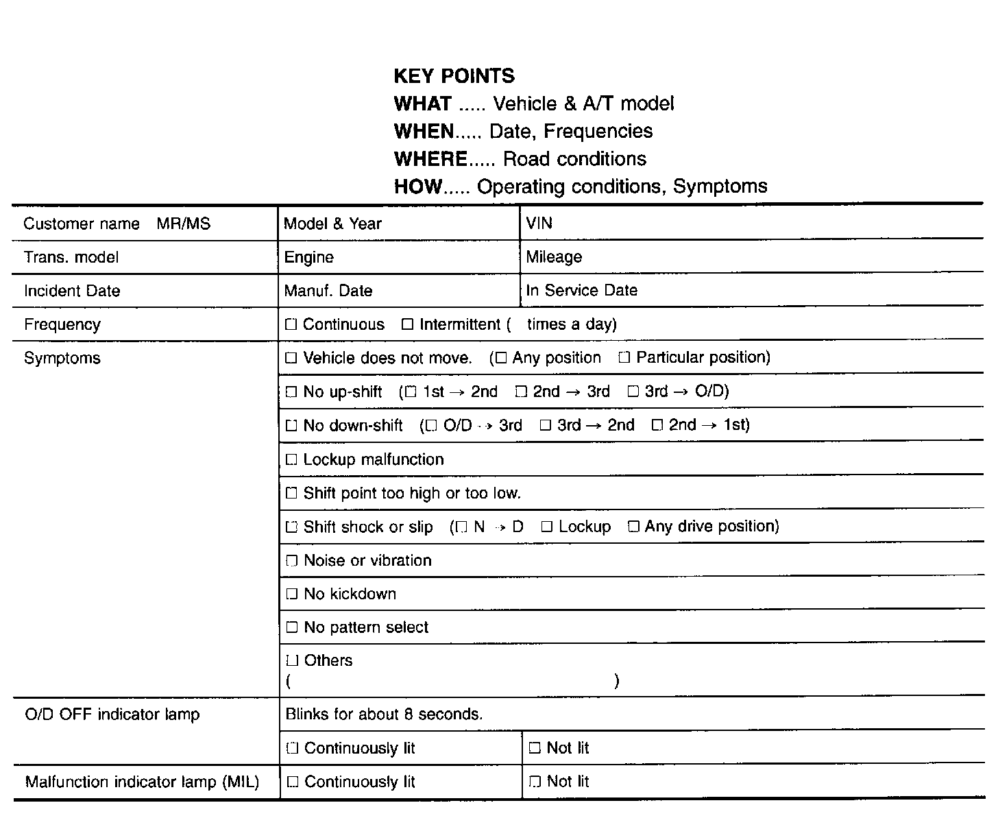 Before undertaking actual checks, take a few minutes to talk with a customer who approaches with a driveability complaint. The customer can supply good information about such problems, especially intermittent ones. Find out what symptoms are present and under what conditions they occur. A "Diagnostic Worksheet" like the example should be used.