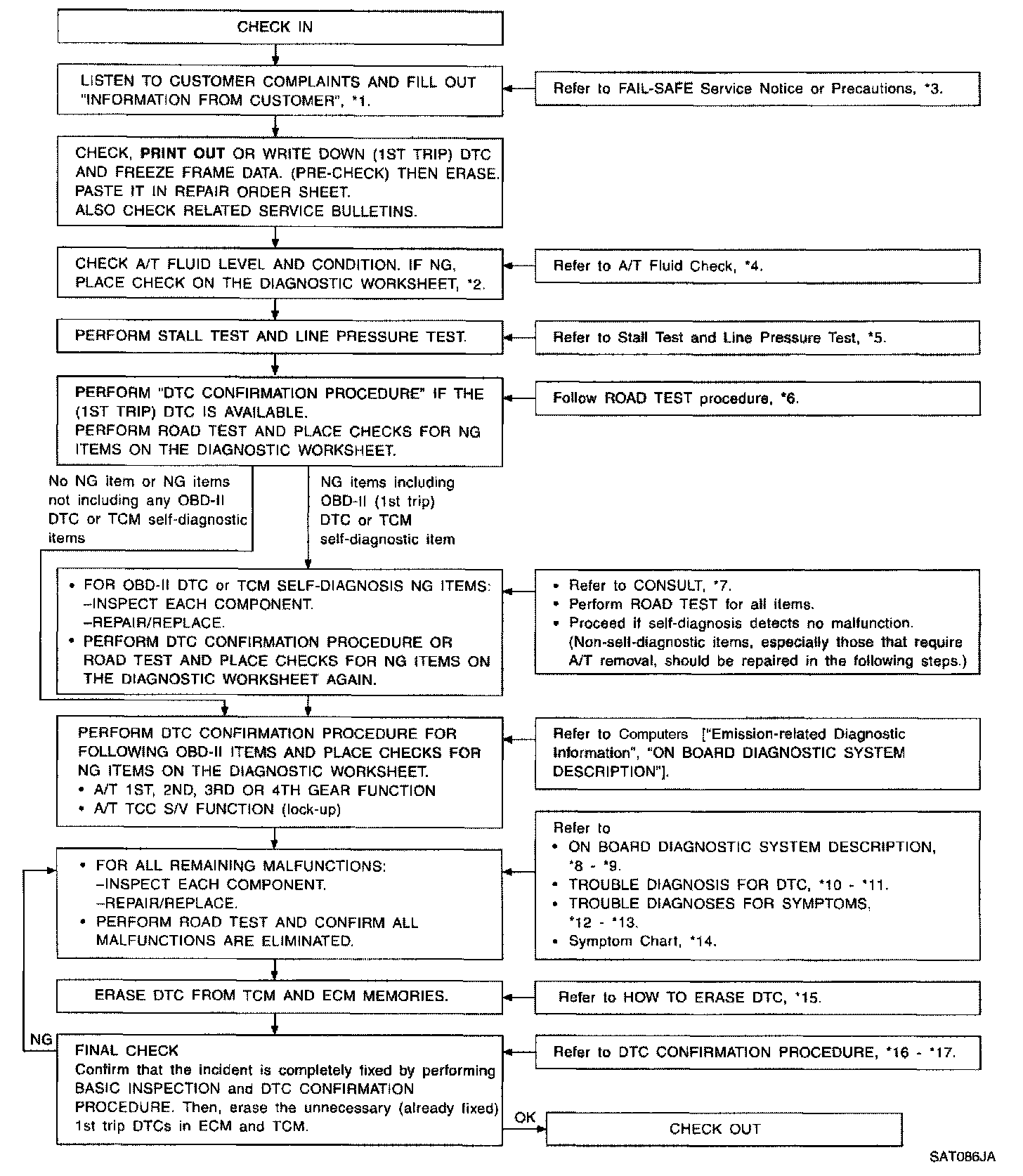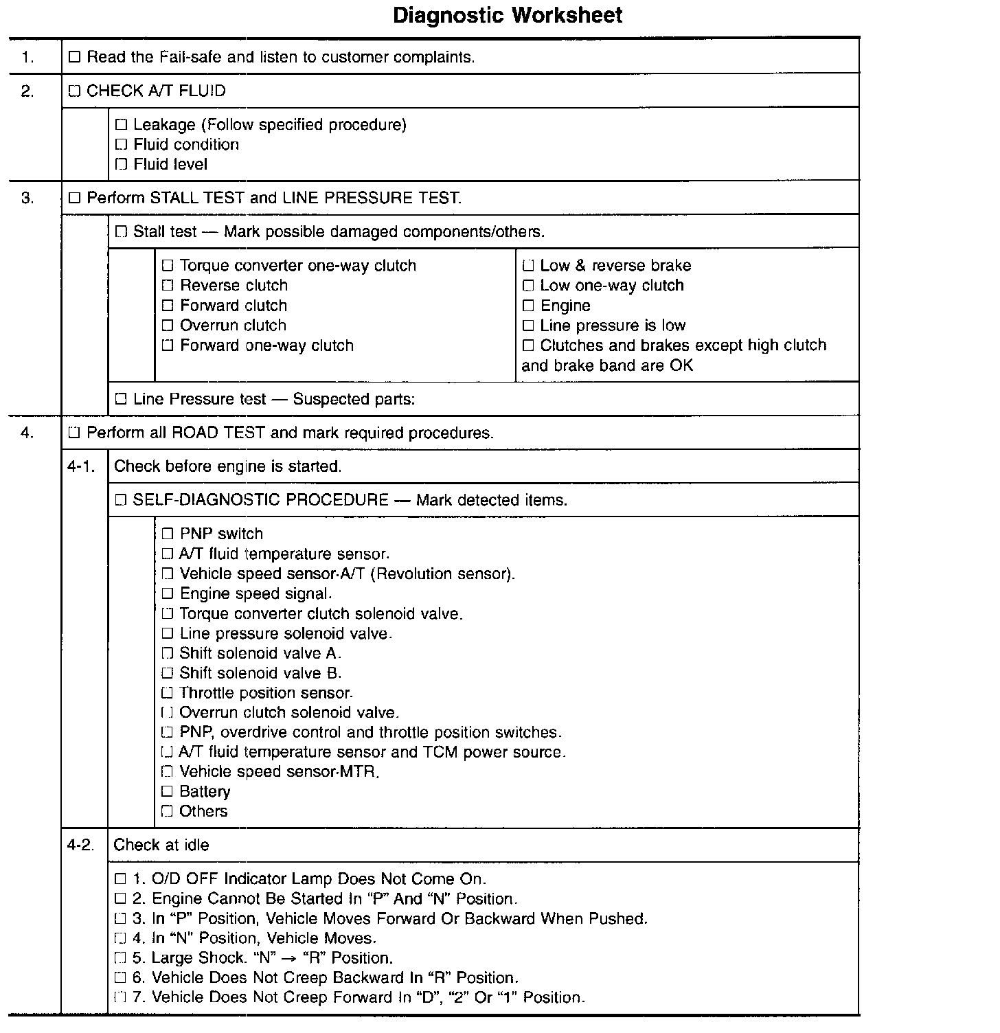 Input and output signals must always be correct and stable in the operation of the A/T system. The A/T system must be in good operating condition and be free of valve seizure, solenoid valve malfunction, etc.