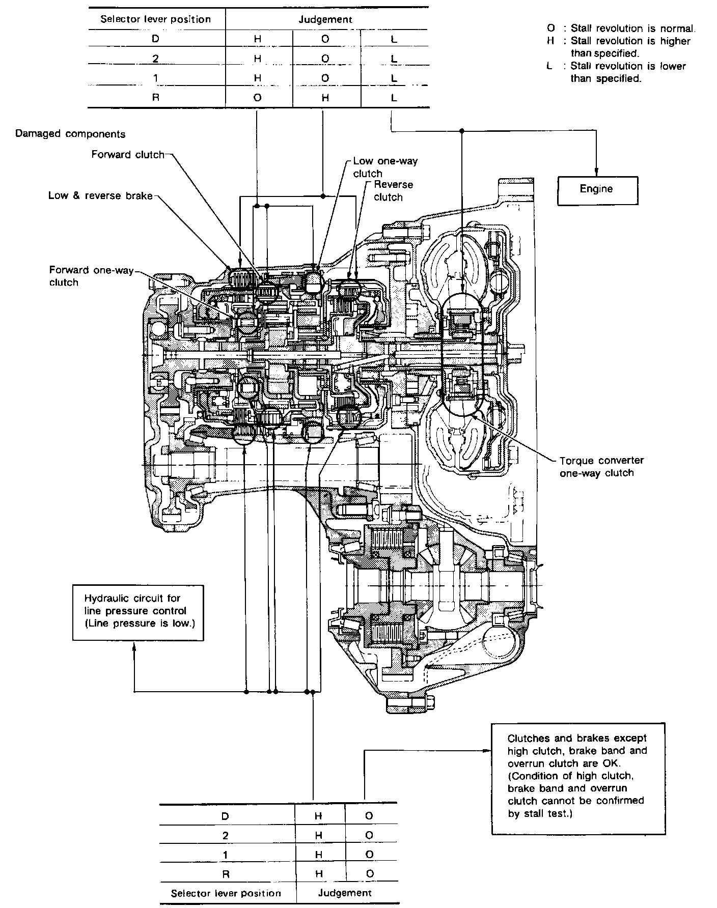 - 1st and 2nd gears in "2" position and engine brake functions with accelerator pedal released (fully closed throttle). Forward clutch or forward one-way clutch slippage