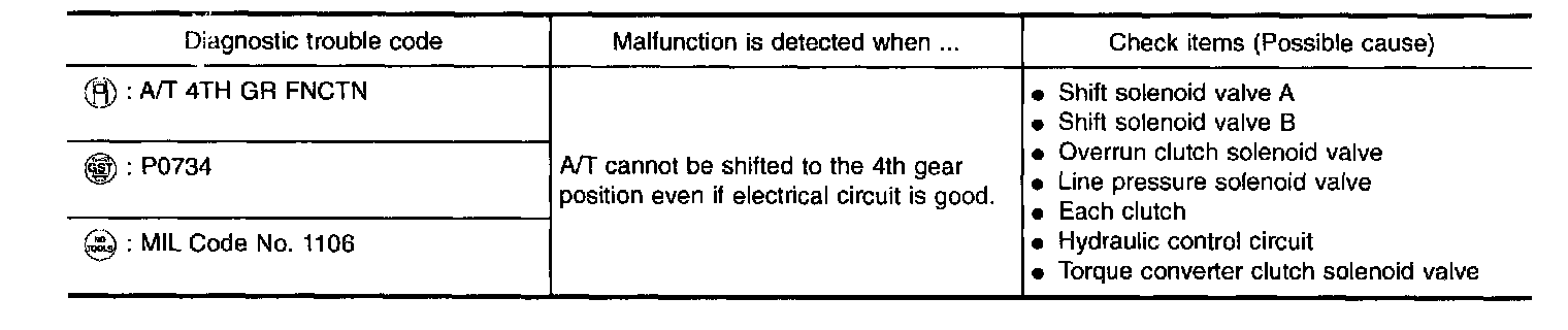 - This malfunction is detected when the A/T does not shift into fourth gear position or the torque converter clutch does not lock up as instructed by the TCM. This is not caused by electrical malfunction (circuits open or shorted) but by mechanical malfunction such as control valve sticking, improper solenoid valve operation, malfunctioning oil pump or torque converter clutch, etc.