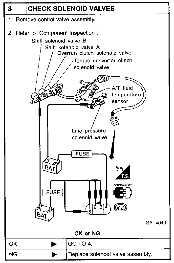 - Check solenoid valve by listening for its operating sound while applying battery voltage to the terminal and ground.