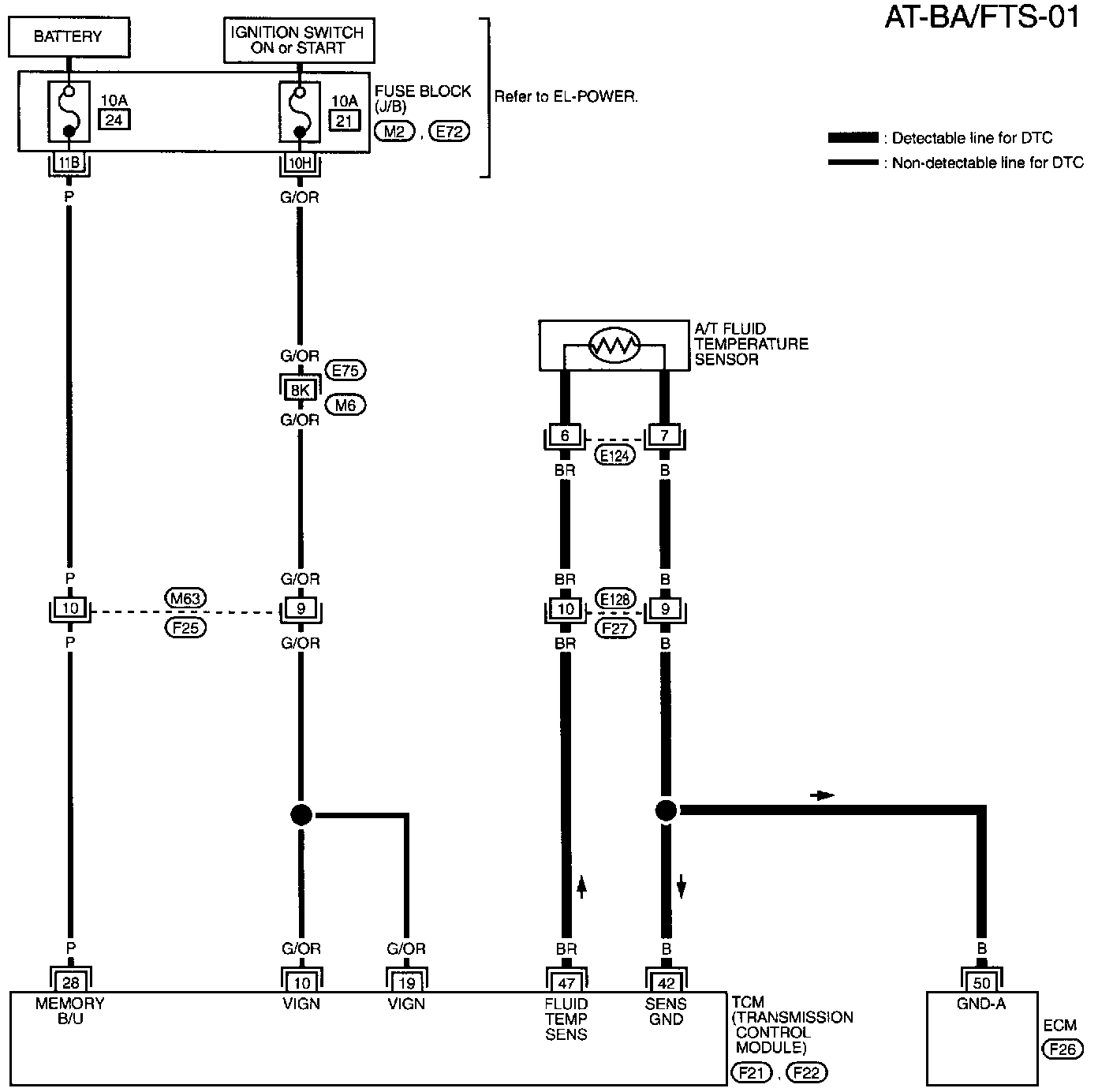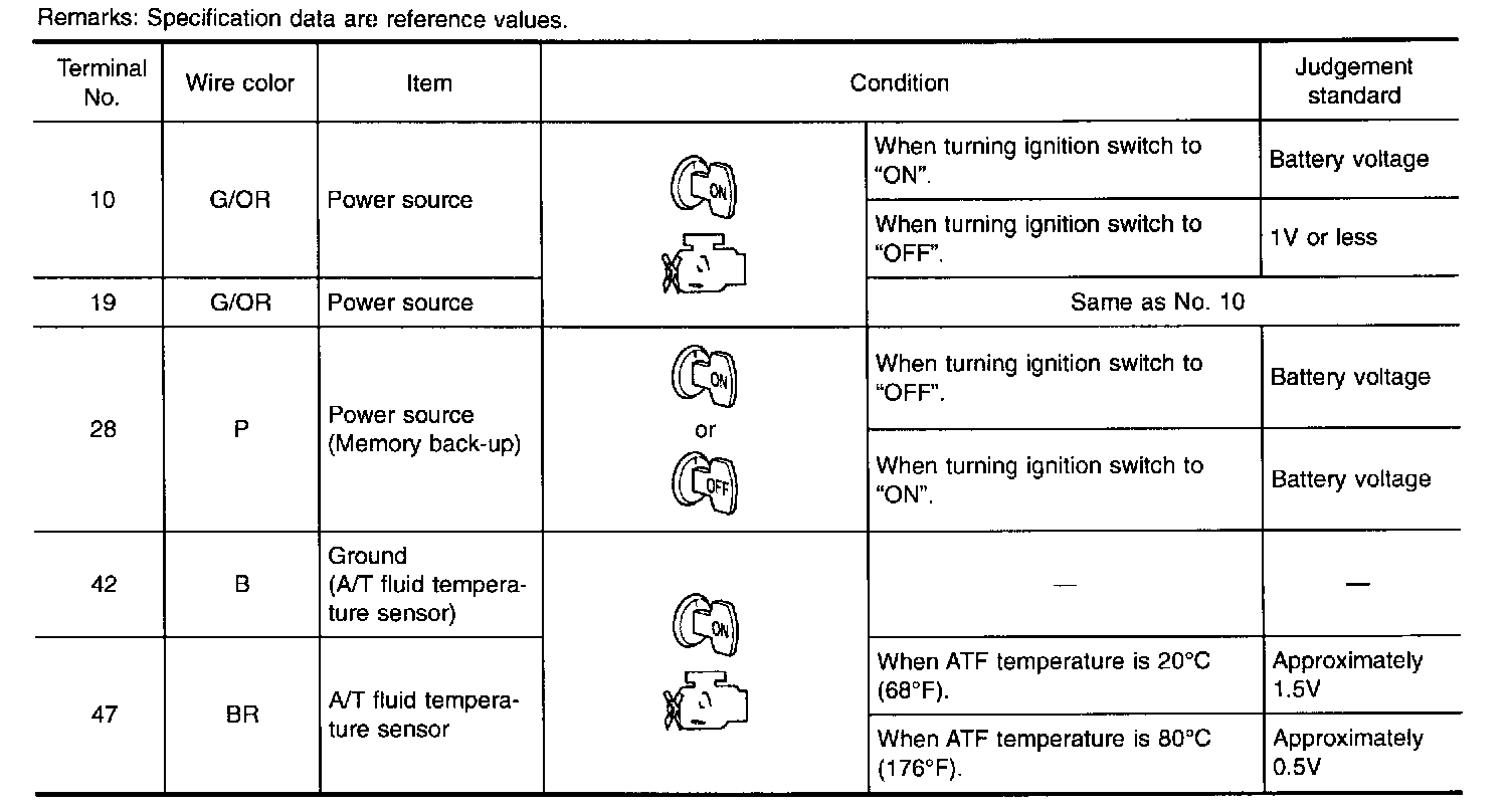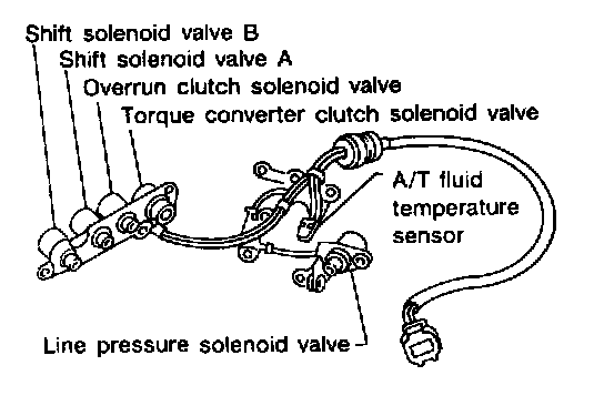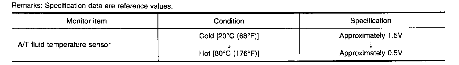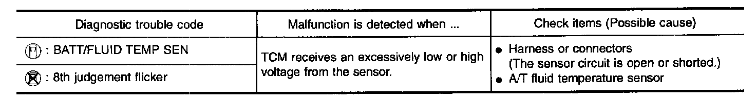 The A/T fluid temperature sensor detects the A/T fluid temperature and sends a signal to the TCM.