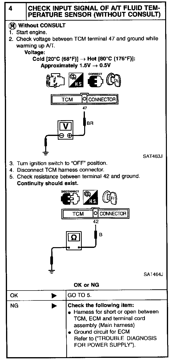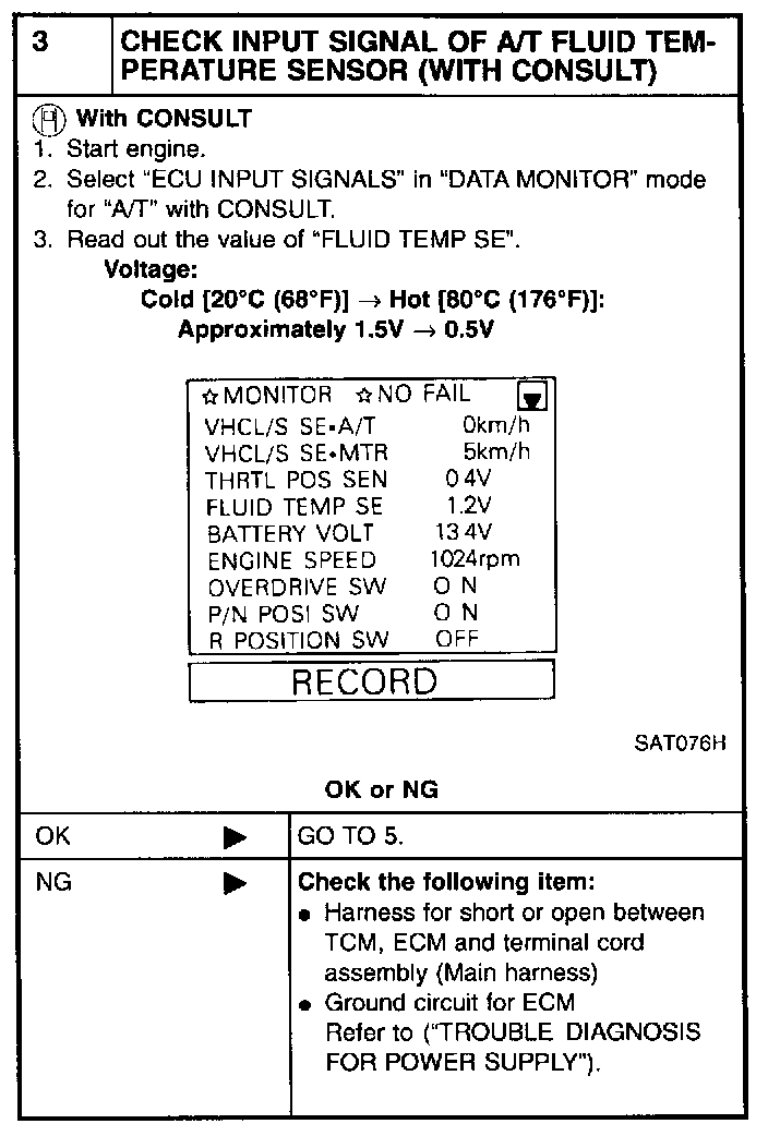 4 CHECK INPUT SIGNAL OF A/T FLUID TEMPERATURE SENSOR (WITHOUT CONSULT):