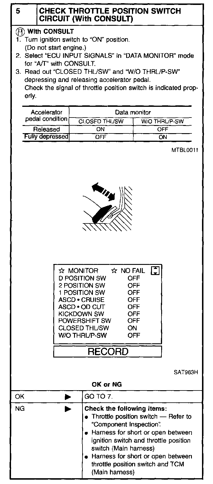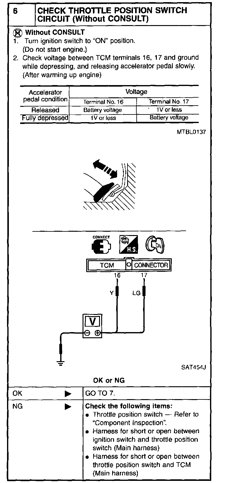 2. If NG, check again with manual control cable disconnected from manual shaft of A/T assembly. Refer to step 1.