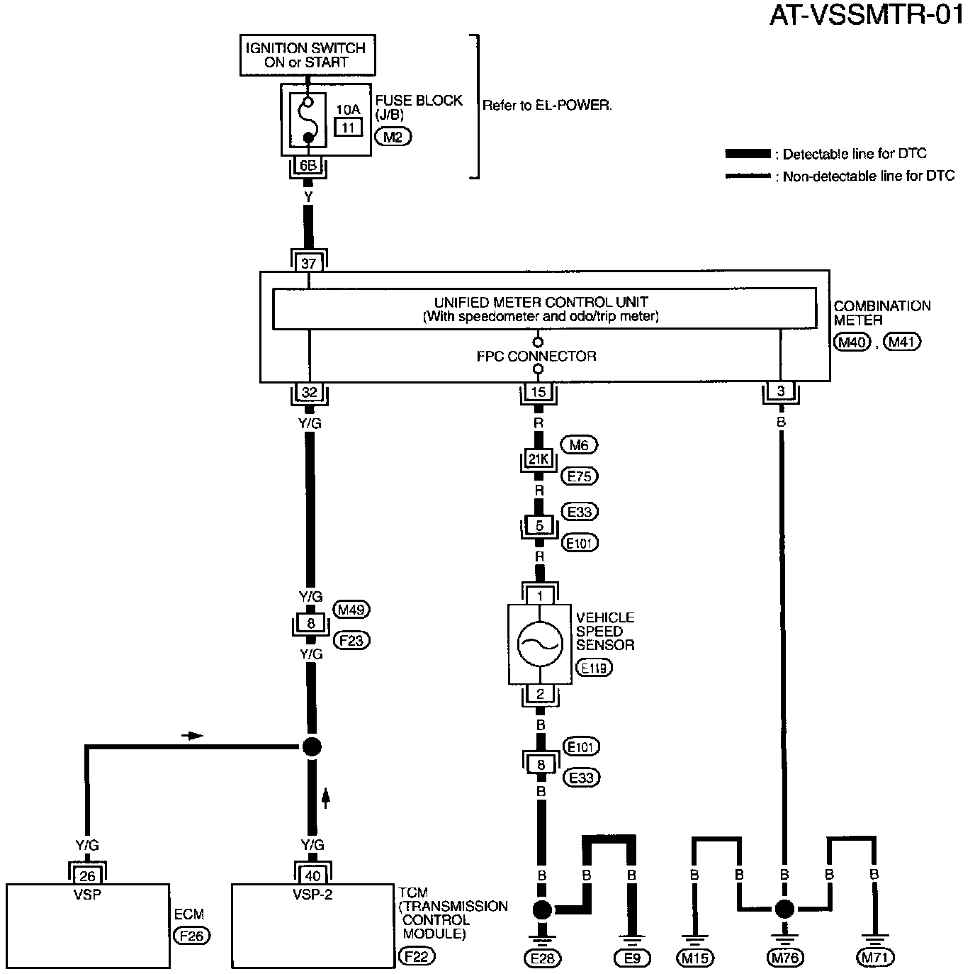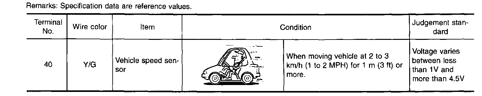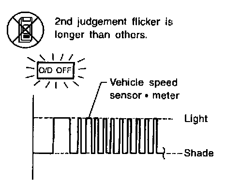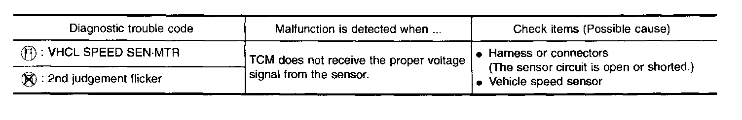 The vehicle speed sensor~MTR is built into the speedometer assembly. The sensor functions as an auxiliary device to the revolution sensor when it is malfunctioning. The TCM will then use a signal sent from the vehicle speed sensor-MTR.