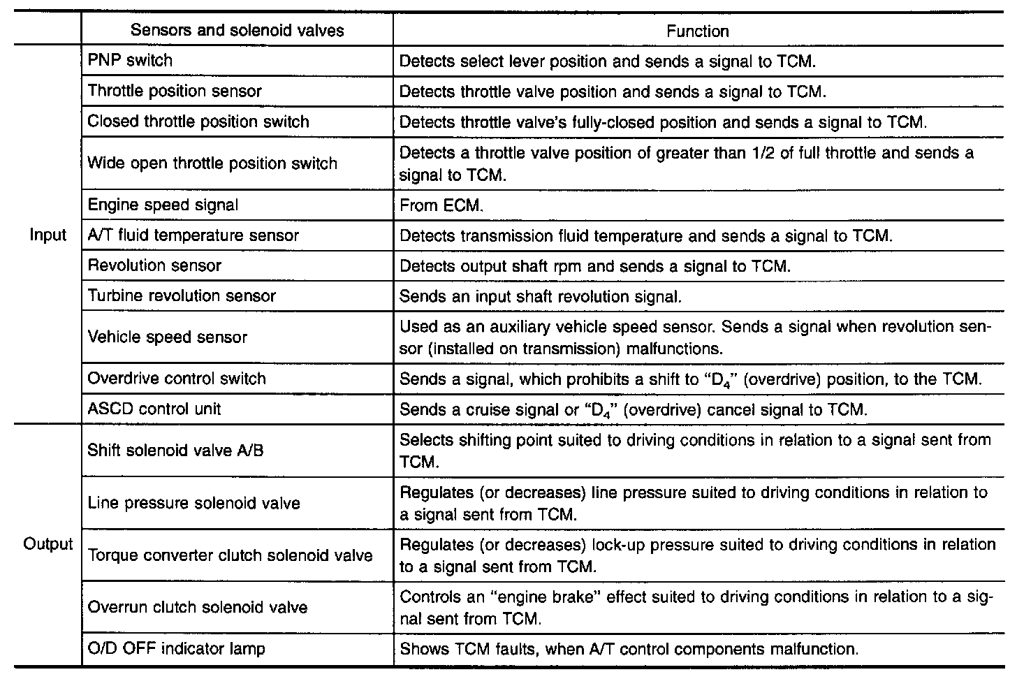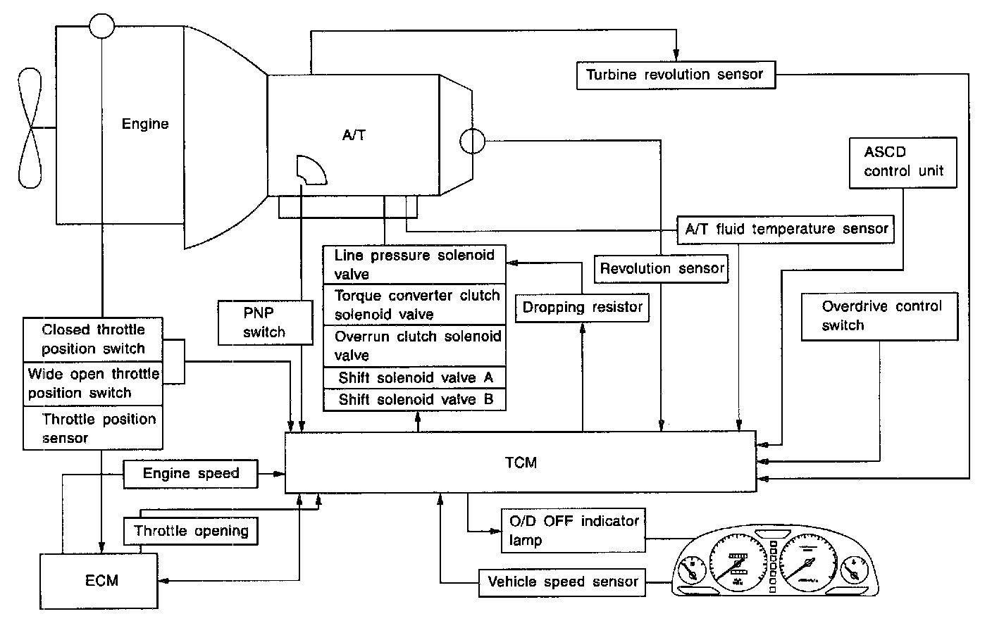 The automatic transmission senses vehicle operating conditions through various sensors. It always controls the optimum shift position and reduces shifting and lock-up shocks.