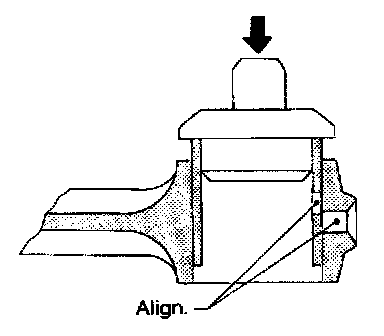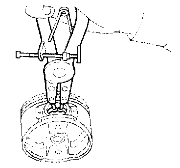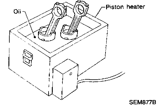 ^ To disassemble piston and connecting rod, first remove snap rings. Heat piston to 60 to 70°C (140 to 158°F) then use piston pin press to remove pin