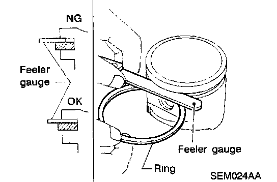 If out of specification, replace piston ring. If clearance exceeds maximum limit with new ring, replace piston.