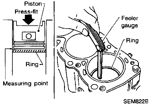If out of specification, replace piston ring. If gap exceeds maximum limit with a new ring, rebore cylinder and use oversized piston and piston rings. Refer to Piston, Engine; Specifications.