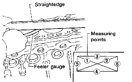 Use a reliable straightedge and feeler gauge to check the flatness of cylinder block surface. Check along six positions shown in figure.