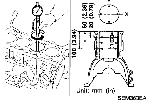 1. Using a bore gauge, measure cylinder bore for wear, out-of-round and taper.
