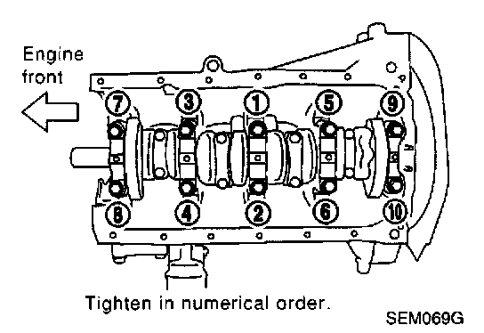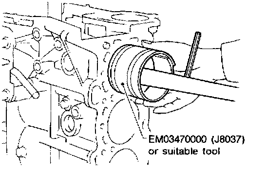 7. Install main bearing caps and tighten to the specified torque. This will prevent distortion of cylinder bores, otherwise cylinder bores may be distorted in final assembly.