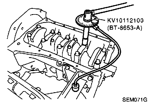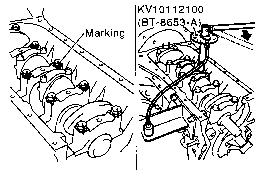 ^ If an angle wrench is not available, mark all bearing cap bolts on the side facing engine rear. Then, turn each bolt specified degrees clockwise. Confirm angle of degrees with a graduator, not by eye measurement.