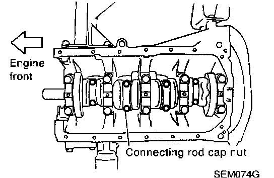 ^ When installing connecting rod nuts and main bearing cap bolts, apply new engine oil to threads and seating surfaces.