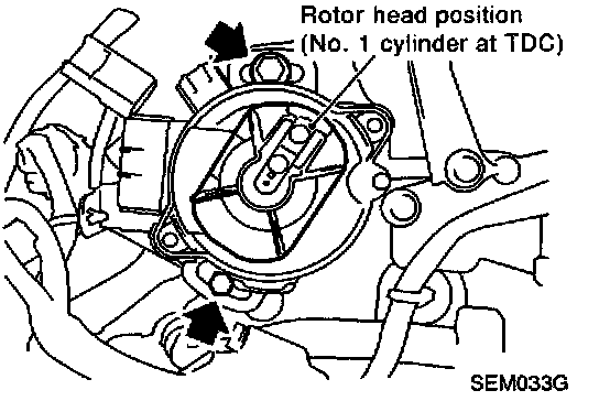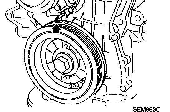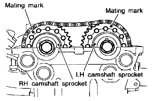 ^ Rotate crankshaft until mating mark on camshaft sprocket is set at position indicated in figure.