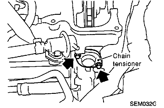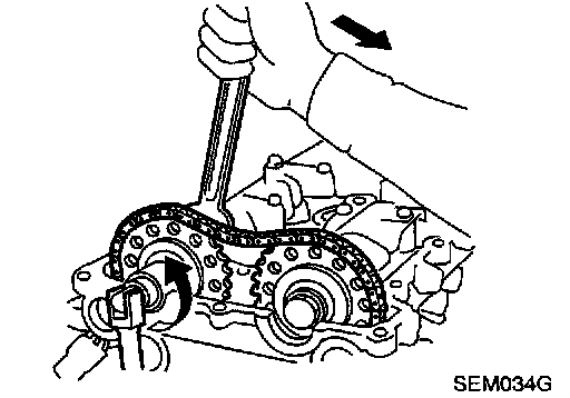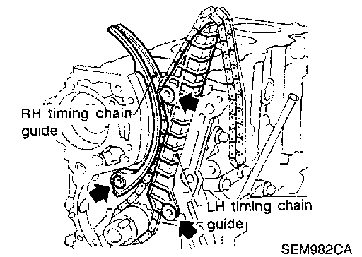 ^ After removing timing chain, do not turn crankshaft and camshaft separately, or valves will strike piston heads.
