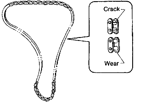 Check for cracks and excessive wear at roller links. Replace chain if necessary.