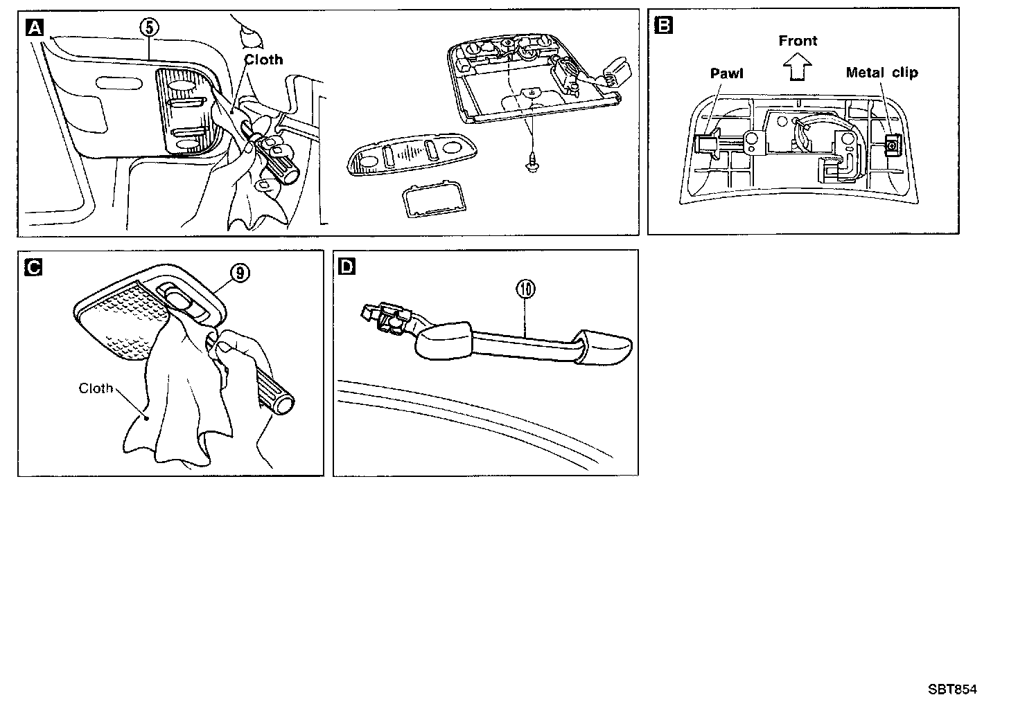 3. Remove front pillar garnishes, center pillar upper garnishes and rear pillar garnishes. Refer to "SIDE AND FLOOR TRIM" for details.