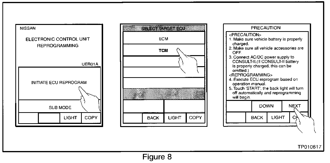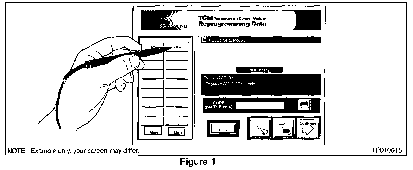 ^ Charge the CONSULT-II battery before proceeding with TCM Reprogramming