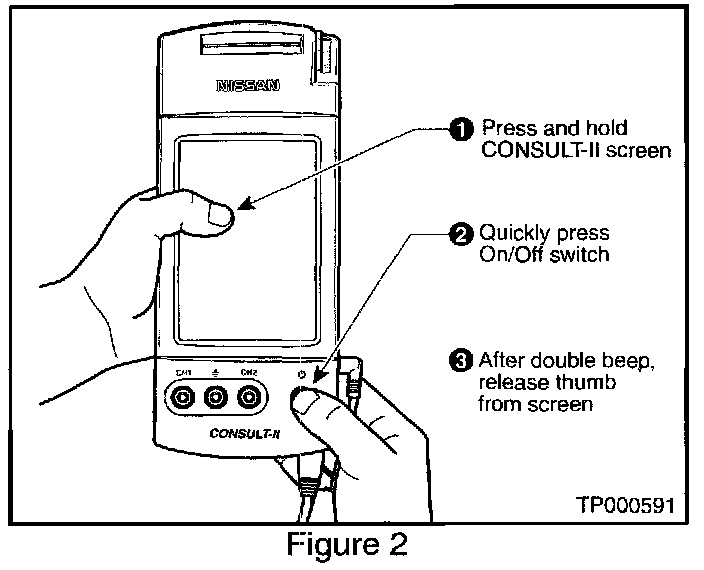 A. While pressing on the CONSULT-II screen with your thumb, quickly depress and release the ON/OFF switch (see Figure 2).