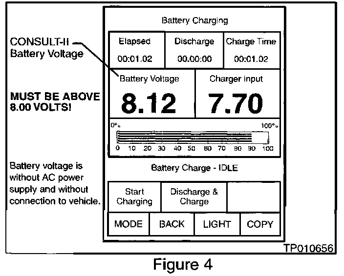 26. After about one minute has passed, check the CONSULT-II's battery voltage reading on the CONSULT-II screen (see Figure 4).