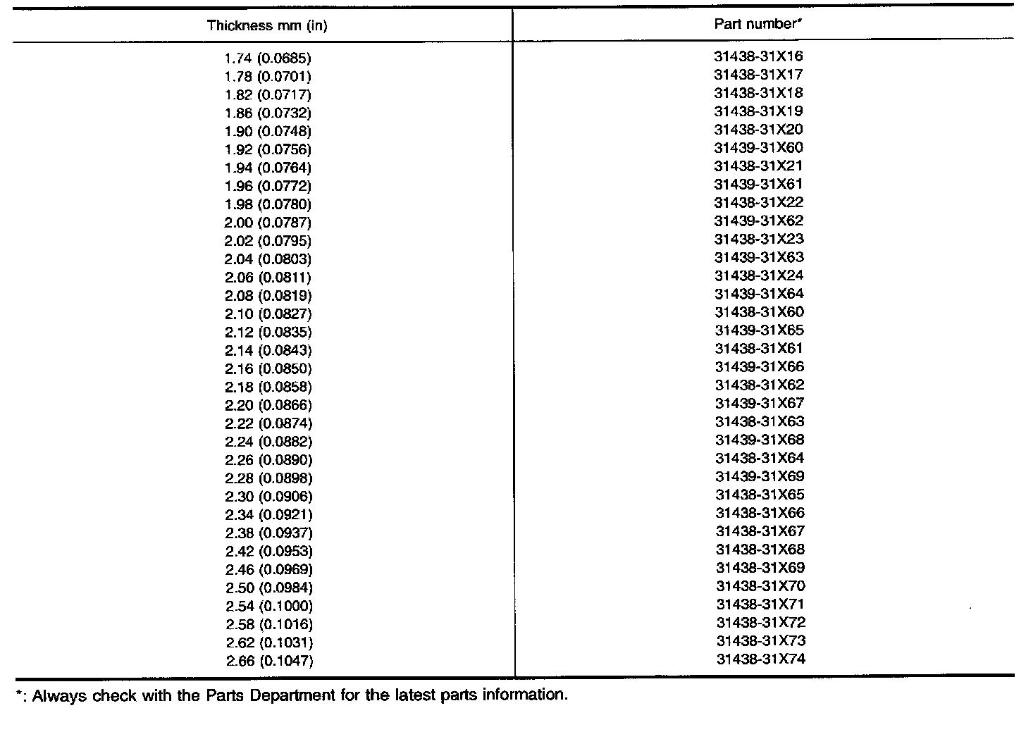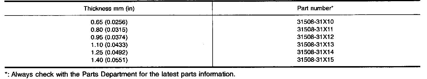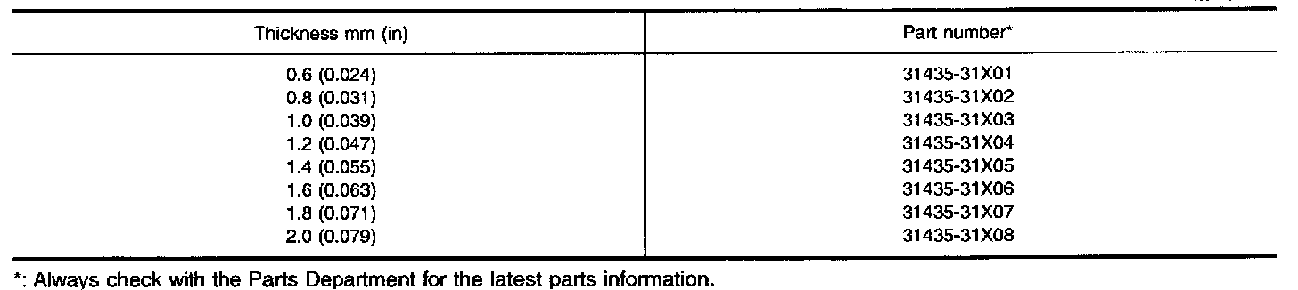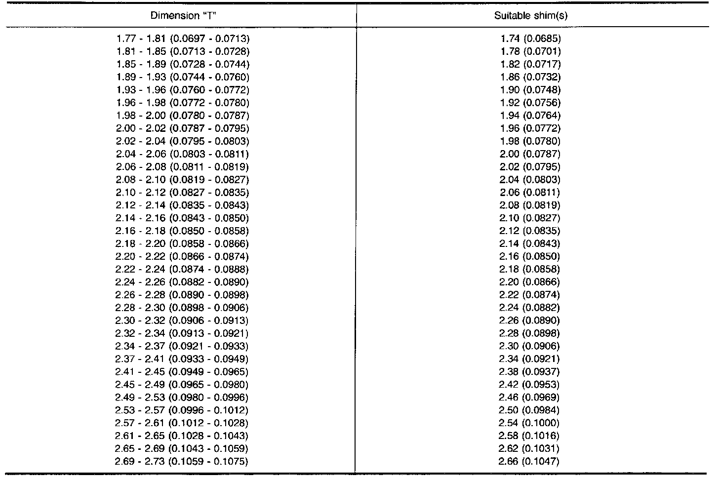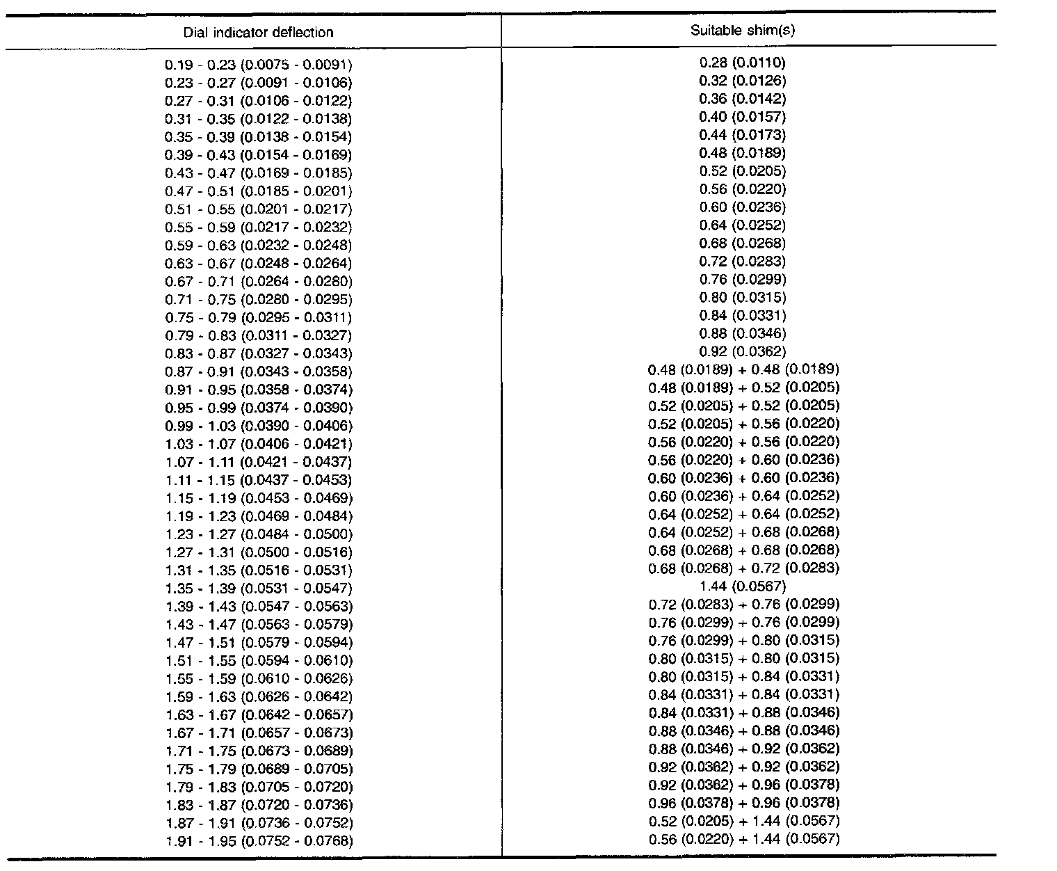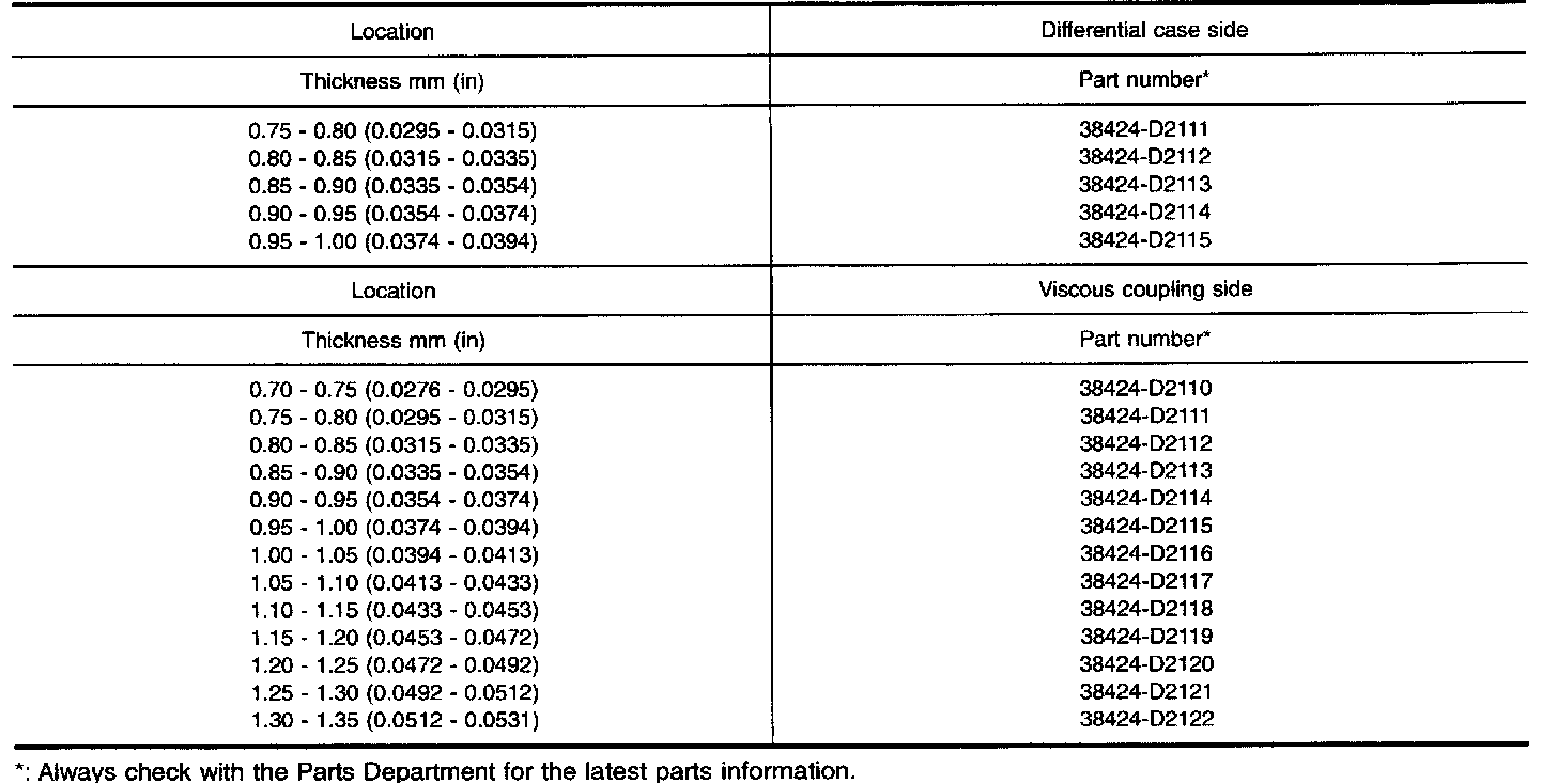 TABLE FOR SELECTING DIFFERENTIAL SIDE BEARING ADJUSTING SHIMS