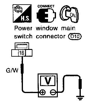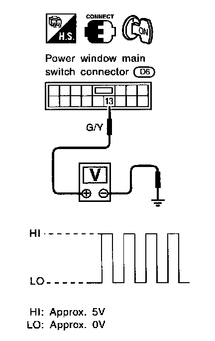 Measure voltage between power window main switch terminal 13 and ground with oscilloscope when power window is in automatic close operation.