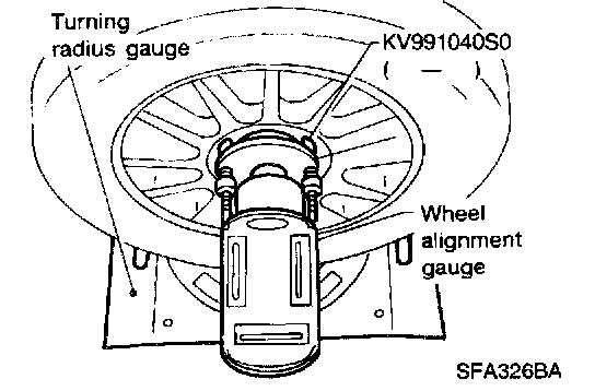 1. Set wheels in straight-ahead position. Then, move vehicle forward until front wheels rest on turning radius gauge properly.
