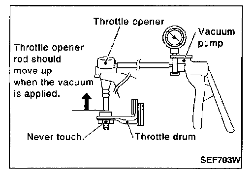 5. Apply vacuum [more than -40.0 kPa (-300 mmHg, -11.81 inHg)] until the throttle drum becomes free from the rod of the throttle opener.