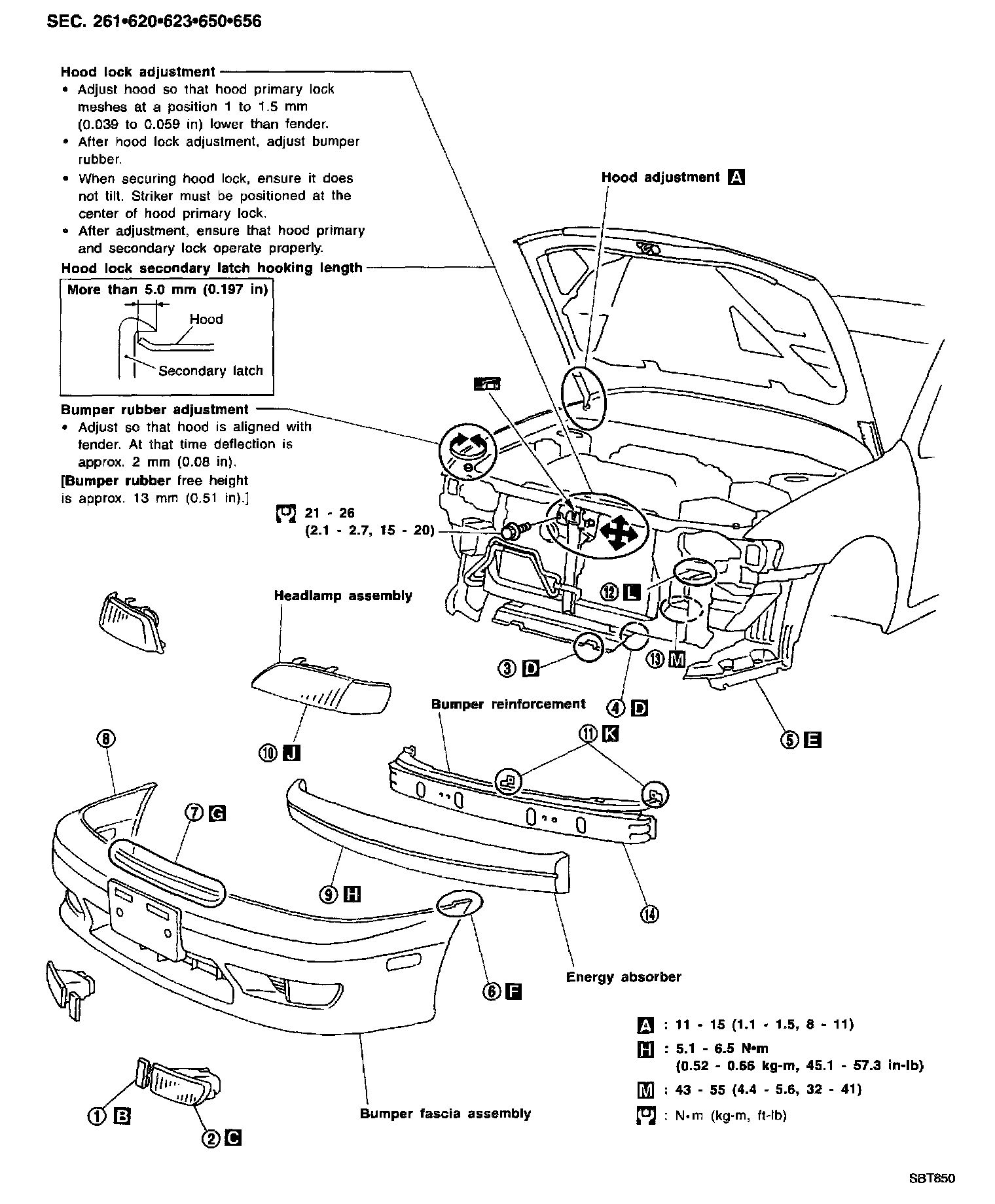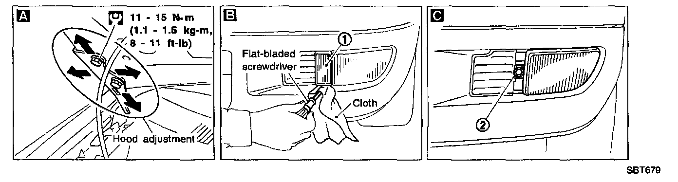 - Hood lock adjustment: After adjusting, check hood lock control operation. Apply a coat of grease to hood locks engaging mechanism.