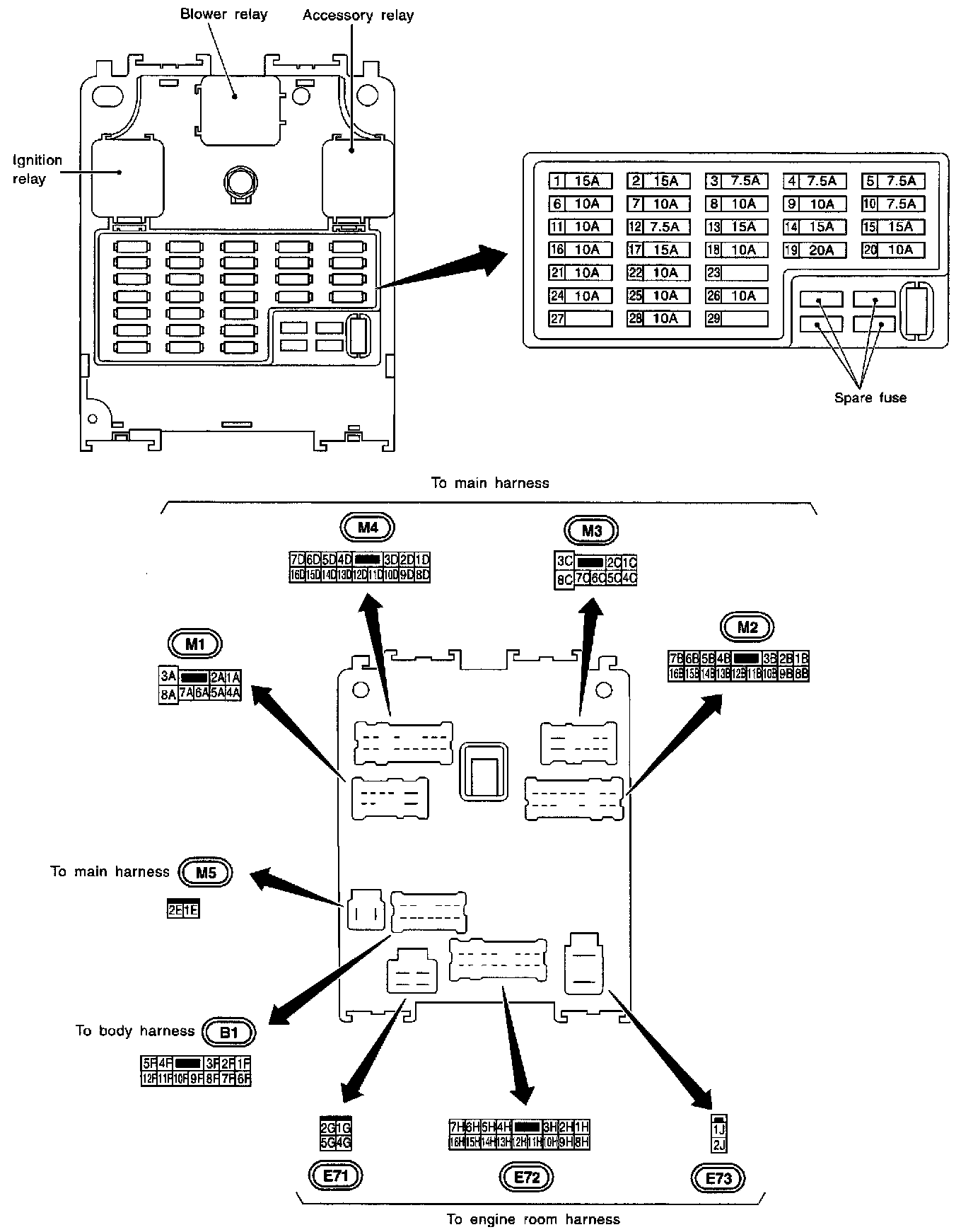 Fuse Block - Junction Box (J/B) Terminal Arrangement (B1, E71, E72, E73, M1, M2, M3, M4, M5):