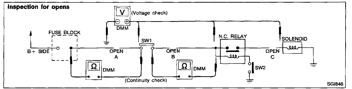 2. Disconnect all loads (SW1 open, relay disconnected and solenoid disconnected) powered through the fuse.