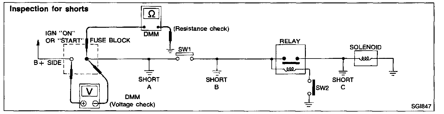 1. Remove the blown fuse and disconnect all loads (i.e. SW1 open, relay disconnected and solenoid disconnected) powered through the fuse.