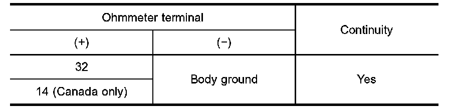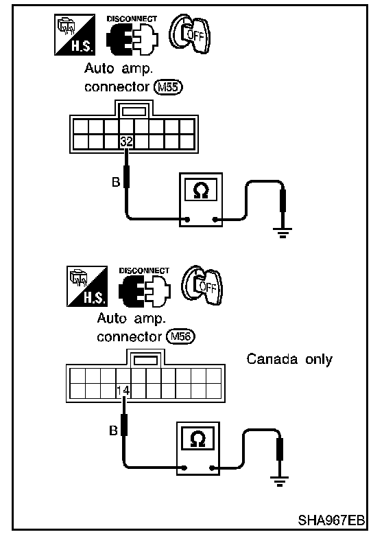 Check body ground circuit for auto amp. with ignition switch OFF. Check for continuity between terminal Nos. 32, 14 and body ground.
