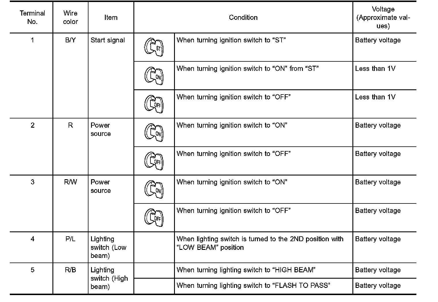 Daytime Light Control Unit Inspection Table (Terminal No. 1 - 5):