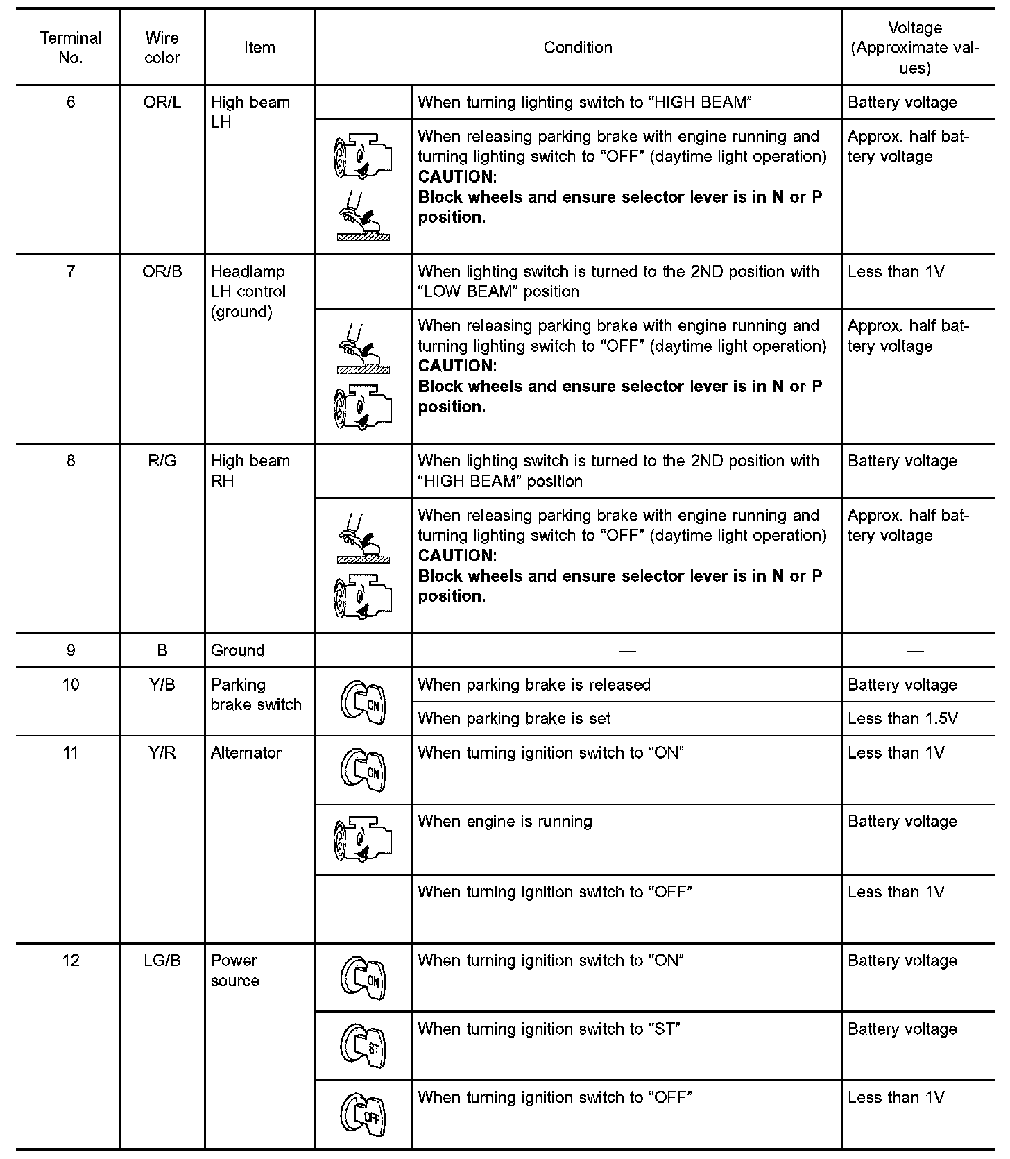 Daytime Light Control Unit Inspection Table (Terminal No. 6 - 12):